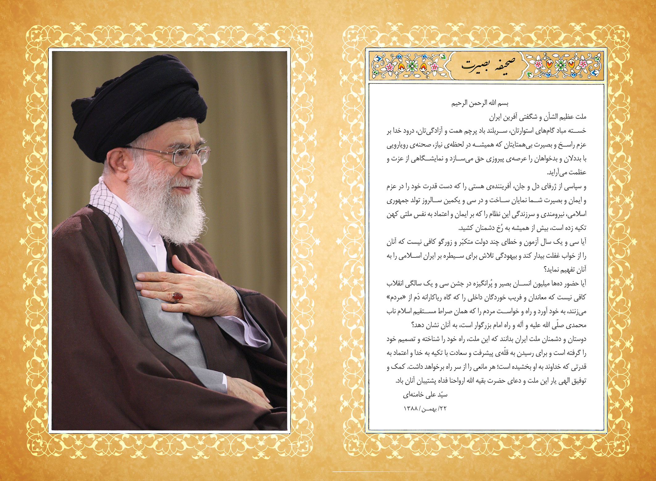 بصیرت مهم است. نقش نخبگان و خواص هم اینست که بصیرت را نه فقط در خودشان، در دیگران به وجود بیاورند.آدم گاهی می بیند که متأسفانه بعضی از نخبگان خودشان هم دچار بی بصیرتی اند، نمی فهمند. اصلاً ملتفت نیستند، یک حرفی یکهو به نفع دشمن می پرانند، به نفع جبهه ای که همتش نابودی بنای جمهوری اسلامی است به نحوی. نخبه هم هستند، خواص هم هستند، آدم های بدی نیستند، نیت بدی هم ندارند، اما این است دیگر، بی بصیرتی است دیگر. این بی بصیرتی را به خصوص به شما جوان ها با خواندن آثار خوب، با تأمل، با گفتگو با انسان های مورد اعتماد و پخته، نه گفتگوی تقلیدی-که هرچه گفت شما قبول کنید. نه، این را من نمی خواهم- از بین ببرید.5/5/88